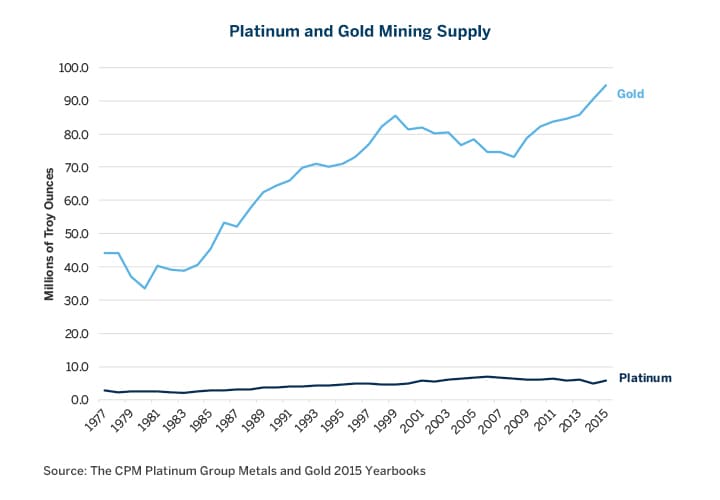 This makes sense, from the narrow perspective of the relative abundance of the two metals in the Earth’s crust. Platinum is about 20% more abundant than gold. What may come as a surprise though is that the world mines only about 6% as much platinum as gold. In 2014, for example, the world mined just over 5 million troy ounces of platinum compared to over 91 million troy ounces of gold (Figure 3).