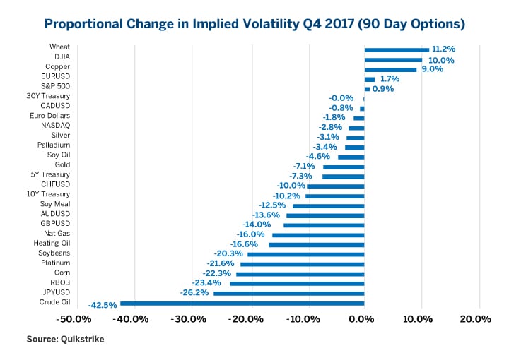 A deeper look at the copper options market, however, shows a high degree of downside skewness as one moves away from at-the-money (ATM) options. Out-of-the-money (OTM) put options on copper command much higher implied volatility premiums than similar OTM call options (Figure 3). Moreover, in Q4 2017, copper’s implied volatility rose relative to its Q3 levels while implied volatility on options fell sharply for most other futures contracts (Figure 4).