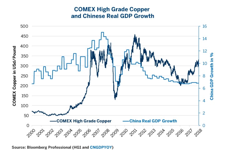 What is the downside risk that copper traders are so worried about? We think it can be summed up in two words: China and equities. China’s economic stabilization in 2016 and 2017 after years of slowing growth was an unexpected and beneficial surprise for copper producers (Figure 5).