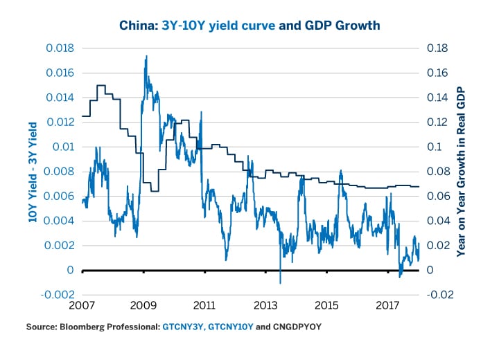 Figure 8: China’s Yield Curve Shape Correlated Strongly with GDP Growth 4-6 Quarters Later.