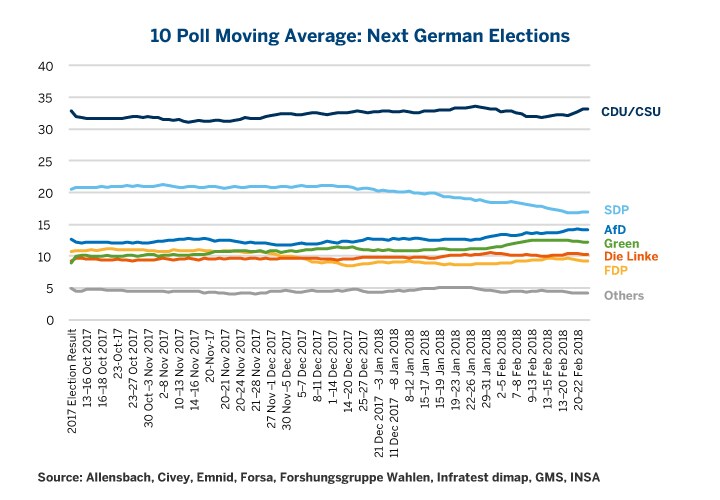 After Merkel failed to assemble a coalition with the Free Democrats (FDP) and the Greens, the SPD was obliged to come back to the negotiating table. While its leaders have agreed to coalition terms with Merkel, its rank and file are currently voting on the prospect of a third go-around with Merkel’s CDU/CSU coalition. They’re not happy about it. Since entering into coalition talks, support for the party has cratered, based on polling (Figure 4). Recently, they have been polling at around 17%, down from an already humiliating and historic low of 20.5% in the elections last fall.