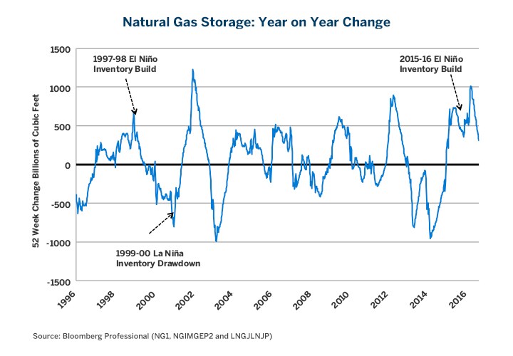 In the past 10 months, many of these assumptions have been borne out. First, an exceptionally mild El Niño winter pushed prices down to as low as $1.61 per mmBtu, the lowest since the winter of 1998-99. Since hitting bottom in March, prices nearly doubled to $3.00 per mmBtu before settling into a range from $2.50 to $3.00. While increased electricity demand due to an exceptionally warm post-El Niño summer in much of North America undoubtedly contributed to the rebound in prices, the other factors mentioned above are also at play: natural gas production is contracting, and there is a secular trend towards increased electricity demand that is independent of the El Niño/La Niña cycle.