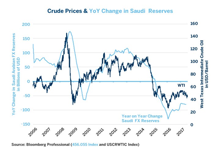 The rebound in oil prices from $26 per barrel in February 2016 to over $50 by early 2017 did slow the pace at which Saudi Arabia was burning through its currency reserves. In February 2016, when oil prices hit bottom, Saudi Arabia’s reserves were $131 billion smaller than a year earlier. One year later, with oil prices to around $50 per barrel, Saudi FX reserves are down by “only” $80 billion from a year earlier (Figure 2). One key factor to watch over the next few months: will the most recent dip in oil prices provoke a faster decline in FX reserves?