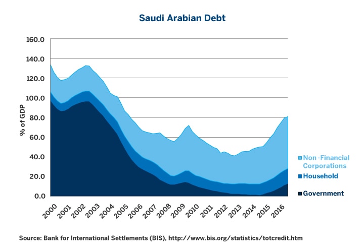 Back in 2000, the Saudis were deeply indebted. The Saudi government’s debt level was close to 100% of GDP after years of deficit spending to offset the collapse in oil prices in 1985 and 1986. By 2015, the government debt had been nearly paid off. Saudi Arabia’s private sector, however, accumulated debt over the same period, rising from 30% to nearly 50% of GDP. Since oil prices collapsed again in 2015, both Saudi public and private sector debt have risen. Public sector debt has gone from 2% to 13% of GDP, and private sector debt has increased from 50% to 68% of GDP. In essence, deficit spending by both the Saudi public and private sectors has kept GDP stable despite the crash in oil prices (Figure 3). Overall, debt at 81% of GDP is roughly double its recent lows but it remains far below the 2000 levels when it exceeded 120% of GDP and pales in comparison to debt levels in countries like the United States, Europe, China, Japan, South Korea and Canada where debt levels generally exceed 250% of GDP.