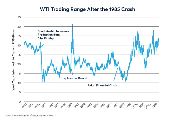 Figure 1: Except briefly during the Gulf War, oil prices did not recover from the 1985 crash until 1999