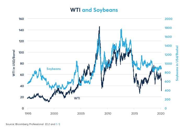Unfortunately, lower energy prices are far from being purely good news for farmers. Some agricultural goods are also used as biofuels that are blended into refined products. Ethanol comes from corn in the US and sugar cane in Brazil. Vegetable oils are also sometimes included in final fuel blends. All these goods track oil prices.