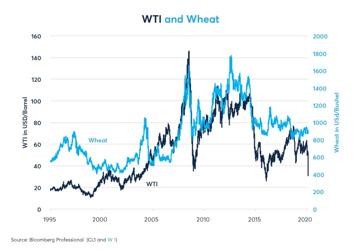 Figure 9: Even wheat, which has no use as a biofuel, tends to trade crude oil prices