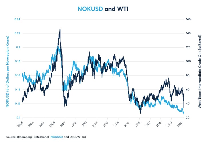 Three currencies, the Canadian dollar (CAD), Norwegian krone (NOK) and the Russian (RUB) ruble often move in tandem with oil prices. All three plunged versus the US dollar in the period from 2014 to 2016 and, like oil, none of recovered since (Figures 13-15). That said, CAD and RUB have decoupled somewhat from oil prices. What remains to be seen is how they might perform during a long period of depressed oil prices.