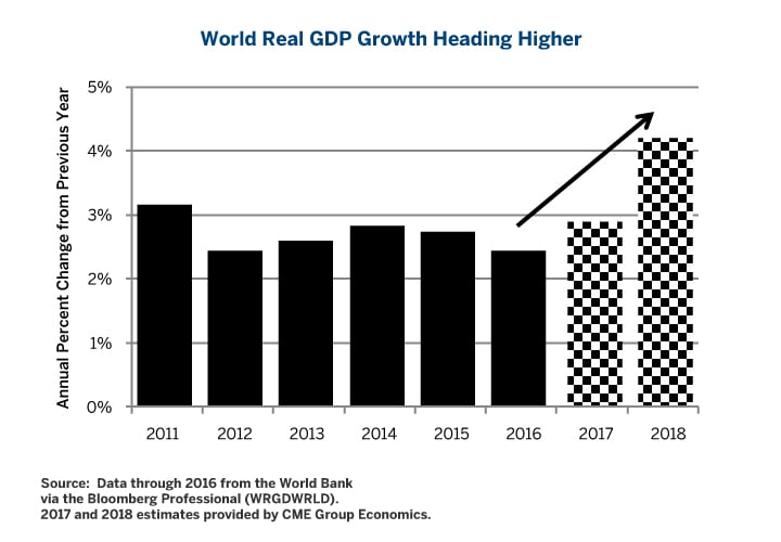 We are now in a second stage of price increases taking the range up toward $60 - $85/barrel. This time around the drivers are, first, the faster pace of global growth and secondly, the arrival of a Mideast risk premium due to rising tensions between Iran and Saudi Arabia, major oil exporters. (See CME Group Senior Economist Erik Norland’s research report from March 21, 2018, “Oil: Could Iran Risk Reverse Options' Bearish Signal?” . Both the global growth and Mideast risk premium price drivers are expected to remain in play for the rest of 2018 and into 2019, keeping upward pressure on the price of oil. There are, however, mitigating factors, too.