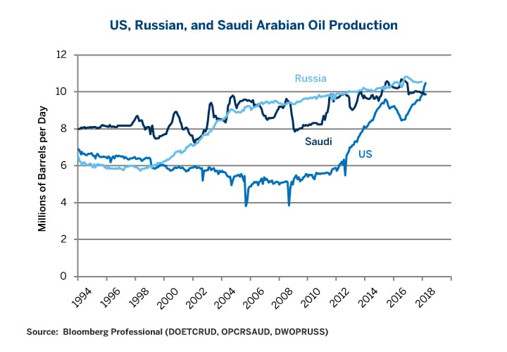 This time around, with oil prices above $60/barrel and rising with global growth and Mideast tensions, the production increases in the second half of 2018 and into 2019 are likely to take U.S. oil production toward 12 million barrels per day in 2019. This compares with current Russian production of around 11 million barrels per day and Saudi Arabian production of about 10 million. One must remember that just before cutting production, both Saudi Arabia and Russia bumped production up close to their limits to make the cuts look bigger. Still, if we are correct that OPEC may roll back its production restraints, then as much as 1.5 million additional barrels a day of Saudi oil may be coming to market in 2019 and possibly 0.5 million barrels a day of Russian oil.