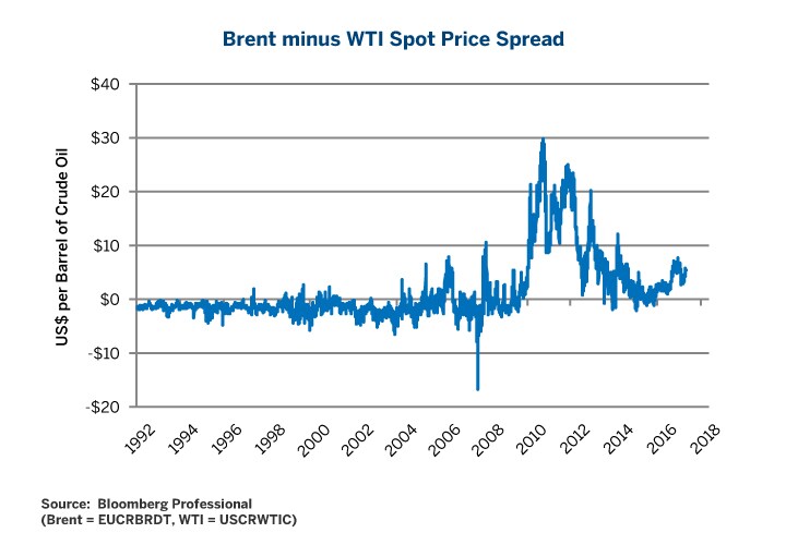 What matters to the Brent-WTI price spread is the connection point around the world. Back in the early stages of the shale oil production ramp-up, oil production overwhelmed the pipeline infrastructure and the Brent-WTI spot price spread widened to $20/barrel or more. Then, railroads came into play and massively increased capacity to bring Bakken oil to the East Coast refineries, where it could compete with Brent, or Brent substitutes, being shipped from Europe and the Mideast. That drove the spread closer to $10/barrel, or more or less the cost of railroad transport. As the pipeline infrastructure was improved the price spread narrowed further. And with the U.S. now an oil exporter, the global connection price is partly determined by shipping costs.