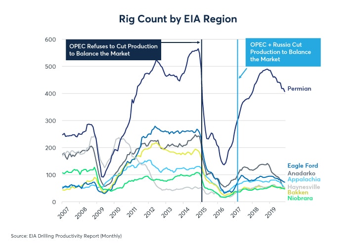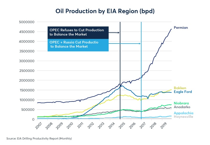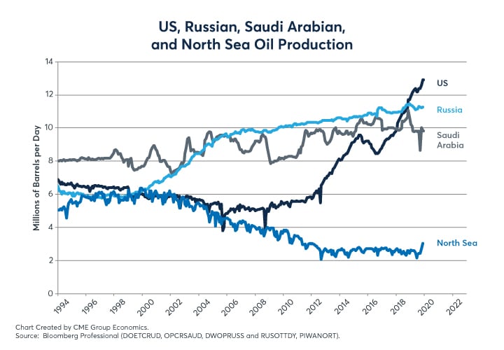 The US now dominates global oil production. It is the largest oil producer in the world, and the share of global oil production attributed to OPEC has been in decline. In the current environment, the Big Three primary oil suppliers, the US, Russia, and Saudi Arabia, effectively call the shots.