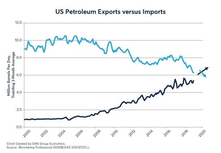 By our estimate, based in part on the degree of backwardation in the January 2020 futures maturity curve, the Mideast tension risk premium was only worth, maybe, $5 to $7/barrel, compared to $15 to $20/barrel before the US shale revolution reduced US oil imports and ramped up US petroleum (i.e., crude plus refined product) exports. The issue we want to frame is both why this risk premium did not respond more aggressively to the Mideast disruptions and what might cause the oil risk premium to rise down the road.