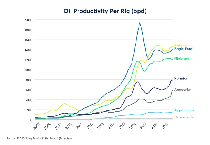 Outside of the Permian, capital expenditure (capex) plunged with oil prices from late 2014 to early 2016 – and it never made anything close to a full recovery. Over the past year, capex has been falling across the board, including in the Permian as well as in other regions. This indicates that prices are currently too low to justify deploying additional equipment. However, should a disturbance in the Middle East or other factors push prices back above $70 per barrel, this trend could reverse. That would be especially true if prices rose back above $90 per barrel.