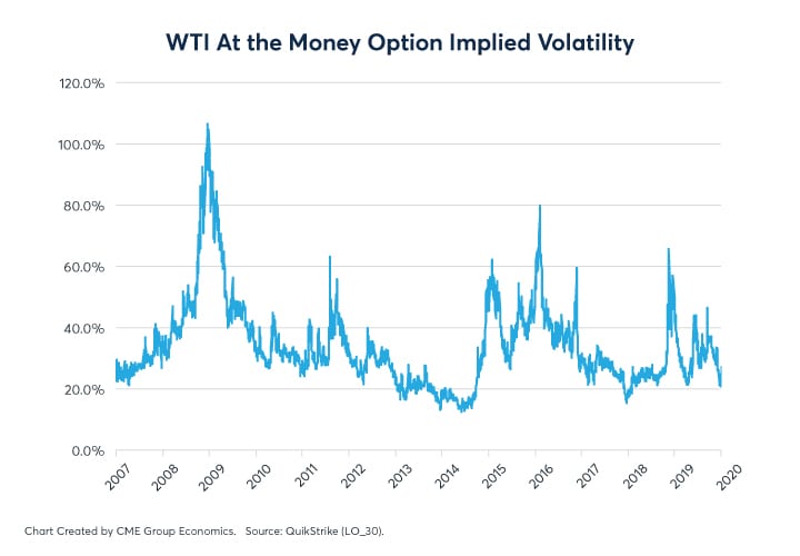 We do note, however, even at the height of the US-Iran tensions in early 2020, implied volatility on 30-day NYMEX WTI crude oil options only made it to 29.4%, a relatively low level by historical standards. In the weeks after, implied volatility fell back modestly towards 26%. If oil inventories were relatively lower than in early 2020 and if US production were to reach a peak production level sometime later in the 2020s, implied volatility has the potential to rise significantly.