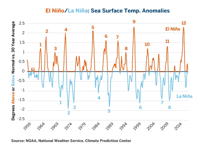 Since 1959, the world has experienced eight significant episodes of La Niña and 12 significant episodes of El Niño, a warming of currents. For the purposes of this paper, we consider an episode to be significant if the National Oceanic and Atmospheric Administration’s (NOAA) Climate Prediction Center Oceanic Niño Index (ONI) falls to or below -1°C in the case of La Niña and rises to or above +1°C in the case of El Niño.