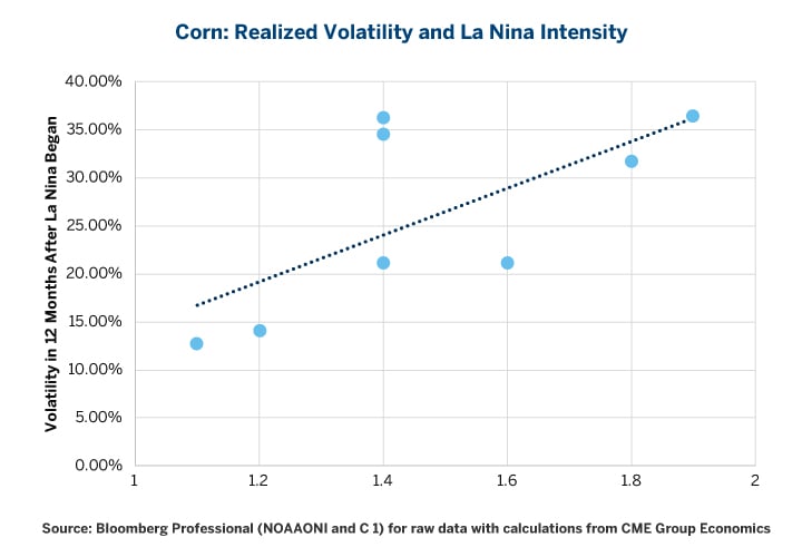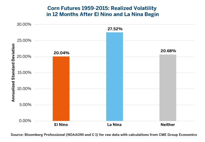 Figure 7: La Niña Often Implies an Exceptionally High Level of Corn Volatility.