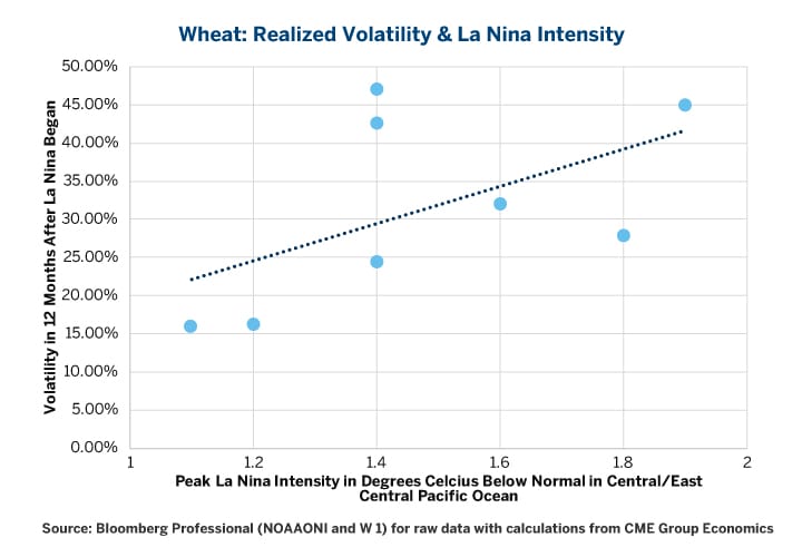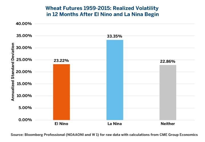The La Niña weather phenomenon tends to bring high volatility and bearish sentiment to U.S. agricultural markets ranging from corn, wheat and soybeans. Investors, producers, end-users and others can manage their risk using global benchmark CME futures and options.