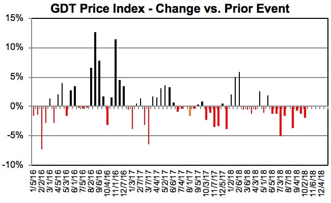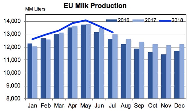 While the US fat market tightens up, the global market remains well supplied. Butter prices in New Zealand dropped to the lowest point since August 2016 before recovering to $4,076/MT – a 12% bounce off the low. European prices fell sharply from early summer highs and have stabilized near $2.20 or low-mid €4,000’s/MT.
