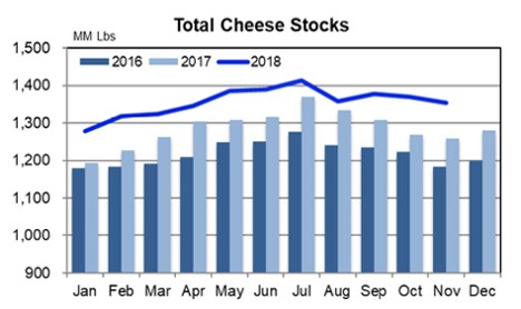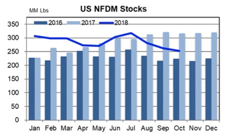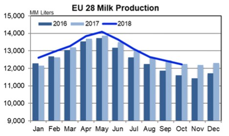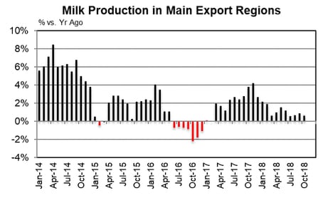 Milk production growth in the US in November was up only 0.6% vs. year ago. Eleven of the top 23 states posted declines vs. year ago with the largest losses coming from states in the eastern half of the country. However, growth in the West more than made up for weakness in the East. Cow numbers declined another 8,000 head and are at the lowest point since January 2017. With improving on-farm economics, the rate of culling and sell-outs should slow, but it might be spring before cow numbers level off. US milk production is forecast to grow around 1% this year. In the past, supply growth of 1% or less was not sufficient to meet domestic and export demand and prices moved higher. This is a watch-out for 2019 as the supply-demand balance is expected to be tighter than the last few years.