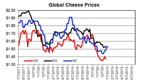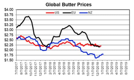 Global SMP prices are moving higher. The NZ/GDT price hit $1.00/lb. ($2,200/MT) on January 2 and the EU EEX price is up to $0.95 (€1,830/MT). The large sales from the SMP intervention program in recent tenders have been viewed as bullish. However, the production just moved from one place to another, so it will still be in the market for a while, just not visible. NZ production is expected to grow modestly and India has been exporting surplus powder. For now, the trend is higher, but not all the news is bullish.