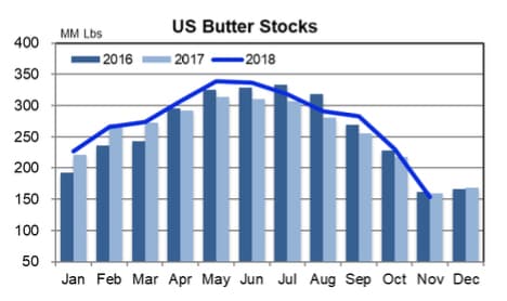 CME butter prices continue to trade in the $2.20-2.25 range following a bullish stocks report. Prices were just starting to weaken following the holiday demand period when the November 30 stocks report showed inventories had fallen to the lowest point since November 2015. Lower milk and cream supplies, particularly in the Eastern half of the country, drove cream multiples to their highest level in several years. Butter prices usually are seasonally weak to start the year, but lower cream supplies and end-user buying are expected to keep the CME butter price around $2.20 give or take 5 cents or so. The higher US price is attracting imports and making US exports less competitive. Unless global prices move higher, this dynamic offsets some of the bullishness in the market.