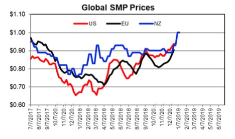 The tone of the global dairy market has become directionally more bullish to start 2019. For the first time since late 2015, the market soon won’t have the price suppressing SMP intervention stocks in Europe to deal with. At current pace, they will be depleted in February following the large sales in December and January. Milk supply growth has slowed in the major production regions and buyers have become more aggressive as prices start to tick higher. However, this isn’t 2013-14 by any means. The global economy is starting to feel wobbly and US stock market indices portend trouble ahead with economists talking more about a mild recession later in 2019 or 2020. Lower oil prices cut both ways – it can be a sign that economic growth is waning and oil exporting countries have less money to buy stuff with (bearish for dairy prices). However, it is bullish for dairy prices in more energy-dependent countries – people will have more money to buy things vs. paying for gas for the car or their utility bills. And trade wars are usually not helpful for economic growth. A resolution to US disputes with Mexico and China would be bullish for dairy markets.