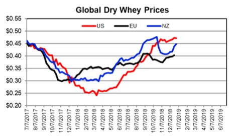 China’s appetite for dairy, and the Chinese economy more broadly, will be a key driver for dairy markets in 2019. With reportedly declining stocks and lower domestic milk supplies, the pace of imports has been increasing in recent months. Imports of SMP in November increased 69% versus last year and were 56% higher than October. However, given higher tariffs, the US share of sales fell. Whole milk powder (WMP) imports were 29% higher than last year and were the largest for the month since the record-setting volume in 2013. As usual, New Zealand captured the majority of sales accounting for 87% of the total. While smaller volume than milk powder, China’s imports of cheese also moved higher. Imports were up 12% from last year with total purchases of 21 million pounds. Chinese whey imports dropped 3% from last year with total shipments just under 100 million pounds. The US share of imports fell dramatically – from 51% last year to 21% in 2018 – a direct result of higher tariffs. If Chinese imports continue to grow at double digits, it will be supportive to global dairy prices.