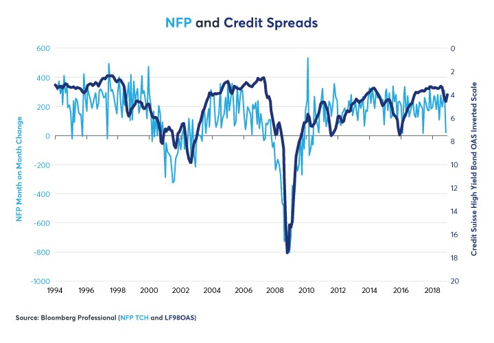 As of early 2019, it’s possible that we are already past the narrowest point for credit spreads. If so, that could be bad news for employment creation. If the Fed’s tight monetary policy (which they assume to be “neutral”), provokes a widening of credit spreads, the economy could quickly find itself with negative net job creation numbers. By our calculations, even just a 2% widening of high yield bond spreads over Treasuries from 4-6% could be enough to put job creation close to zero. In 2015 a credit spread widening of greater magnitude was absorbed by collapsing oil prices and an exceptionally steep yield curve. Oil prices aren’t guaranteed to offset wider credit spreads again and a steeper yield curve isn’t in the works unless the Fed rapidly cuts interest rates. In fact, only Fed easing can really derail the cycle that threatens to send credit spreads and unemployment spiraling higher if monetary policy were to remain too tight for too long.