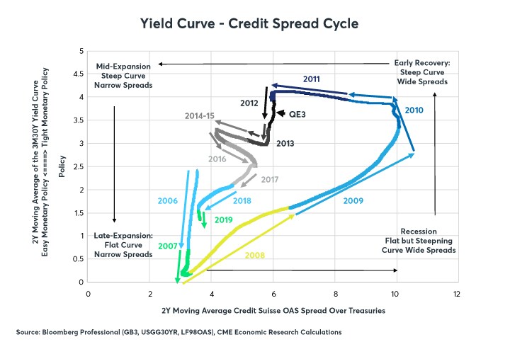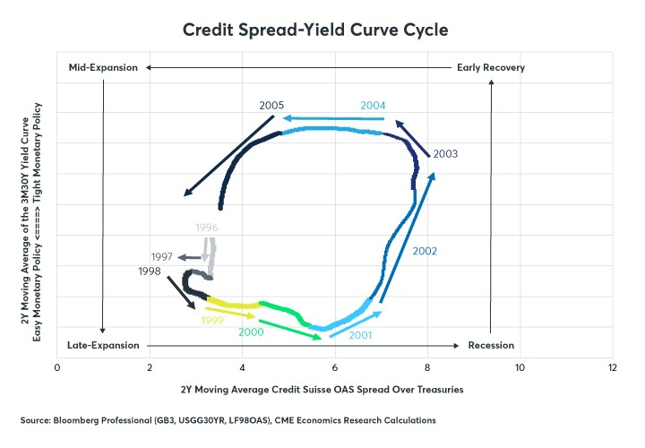 - Late-stage expansion: unemployment stops falling and credit spreads stop narrowing amid an increasingly flat yield curve. Eventually credit spreads begin to widen and employment growth slows. The cycle begins anew (Figures 5-6).