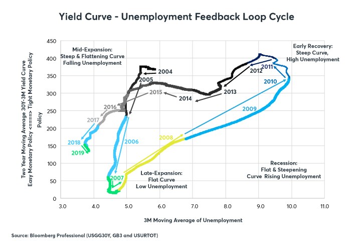 - Early stage-recovery: easy monetary policy manifests itself through a steep yield curve, which in turn, begins to narrow credit spreads and ease unemployment.