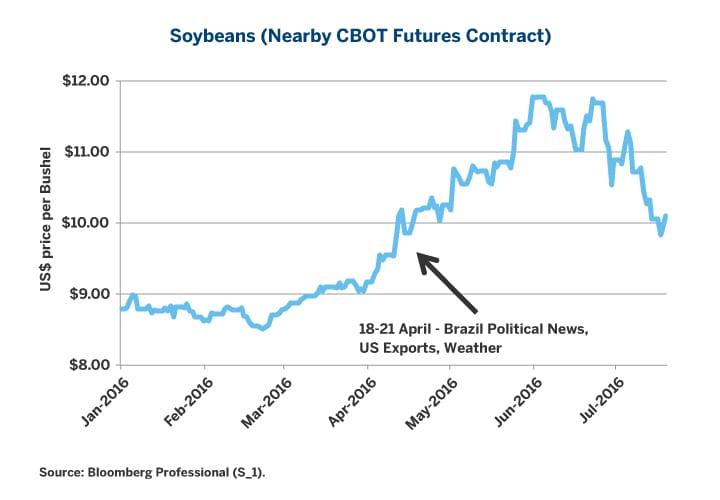 The week of 18 April, 2016, was an exciting one for agricultural products. In the U.S., export inspections indicated larger-than-expected sales. In South America, weather patterns encouraged corn and soybean buying as a string of rainy days in Argentina coupled with dry heat during pollination in Brazil made U.S. corn and soybeans ever more attractive. Early in the week, Brazil’s Lower House voted to initiate impeachment proceedings against then President Dilma Rousseff. Later that week, Brazil eliminated its corn import tax. All of these factors combined to push prices higher.