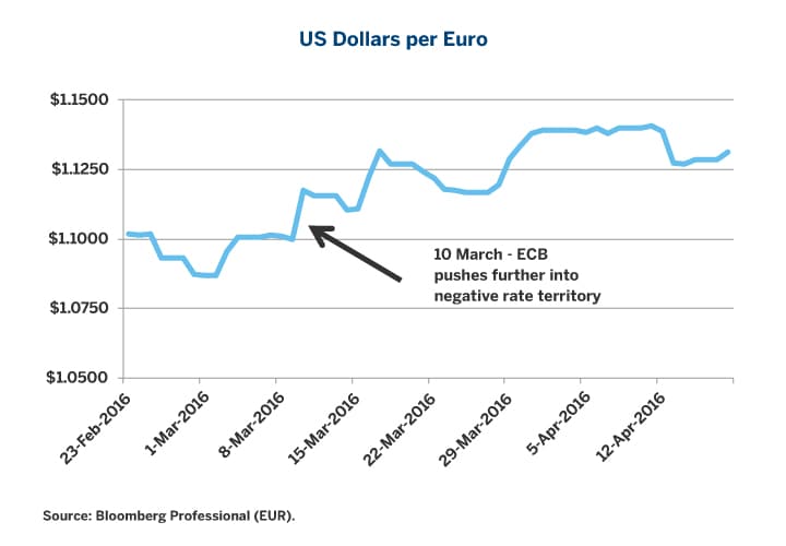 At the ECB policy meeting on Thursday, March 10, 2016, the central bank pushed its deposit rates further into negative territory. The intent was to weaken the euro against the U.S. dollar and other currencies. And the euro did depreciate with the instantaneous market reaction, only to turnaround and appreciate to the surprise of many. Negative rates, however, work to penalize a capital-constrained banking system and may lead to a further disruption of credit markets rather than encouraging them to expand lending. That is, while counterintuitive to some, negative rates were treated by the market as a net tightening of credit, and the euro appreciated.