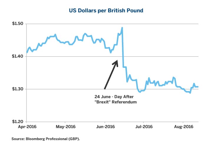 On the June 23, 2016, the referendum in the UK delivered a decisive victory for the “Leave” camp in a rejection of membership in the European Union. At dawn on June 24 came the resignation of British Prime Minister David Cameron, who had called the referendum and advocated for the “Remain” camp. Before the polls had closed, there was a general sense that probabilities favored the “Remain” camp. Within hours after the polls had closed and the results started to trickle to the news media, it was clear that a big surprise was at hand. Markets aggressively took the value of the pound lower by about 7%. Equity markets across Europe sold-off in sympathy on the day, although they recovered in later weeks while the pound did not.