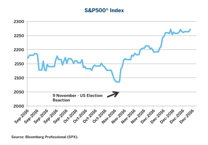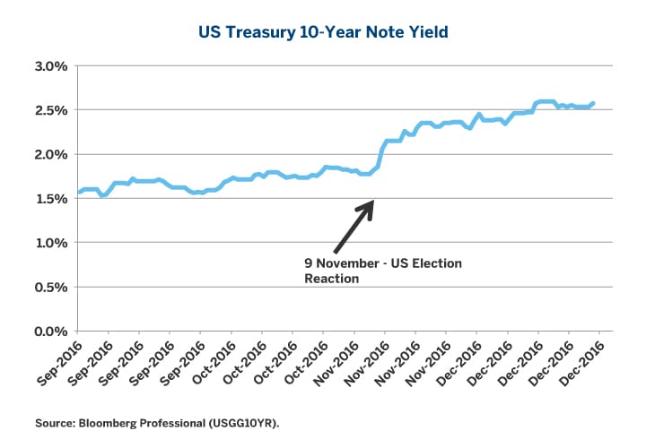 The U.S. election on November 8, 2016, like Brexit, delivered a surprise, with a clean sweep of the White House, Senate, and House of Representatives by Republicans. The instantaneous market reaction was to take equity index prices sharply lower, by about 5%. Overnight in U.S. time, however, a vigorous turnaround was initiated, and U.S. equities finished up on the day on Wednesday, November 9. Stocks kept on going higher into the year-end, as market participants realized that the Washington gridlock had been ended, and they cheered the prospects of lower tax rates on corporations, lighter-touch and less costly regulations, and the potential for infrastructure spending down the road. In contrast, as equities were rallying, U.S. Treasuries were seeing prices fall and yield rise on expectations that a stimulative fiscal policy meant large budget deficits, rising national debt, and more inflation ahead.
