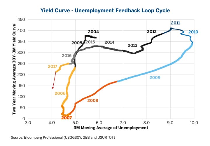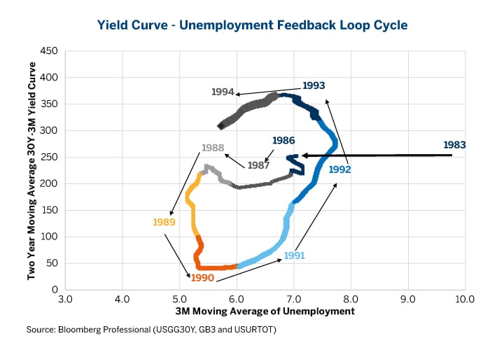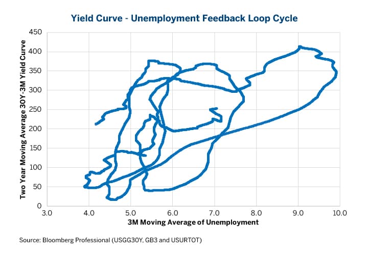 - Like with the VIX and credit spreads, unemployment is also involved in a cycle with the yield curve.