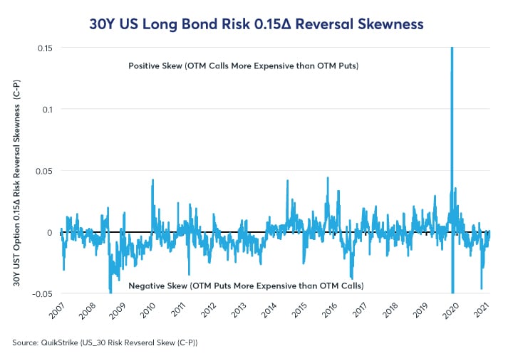 Bond options, too, don’t seem particularly concerned by the recent rise in inflation. Implied volatility on 30Y U.S. Long Bond options are trading at fairly average levels by historical standards (Figure 4), and the skewness of those options shows that investors price roughly equal upside and downside risks (Figure 5).