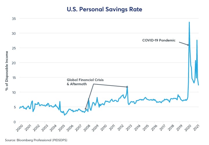 Those arguments are all well and good, but what if they don’t pan out? What if the high savings and soaring personal net worth fuel an economic boom even after the fiscal stimulus ends? In the aftermath of the global financial crisis, household net worth plunged 15%; since the end of 2019, it has risen 16% (Figure 6). And savings rates remain high: U.S. households saved 12.4% in May, compared to 7.3% on average in the nine months before the pandemic began (Figure 7).