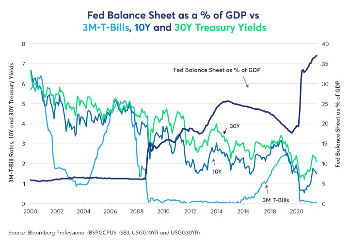 Clearly, some market commentators are worried about these possibilities. The bond market doesn’t seem to price these risks at all. For an economy that is surging, the U.S. yield curve is remarkably flat – a spread of just 190bps separates 3M T-Bills and 30Y Treasury Long Bond yields. In the early stages of previous expansions, the spread was usually closer to 400-500bps. But this opens up one final possibility: bond investors are, in fact, worried about overheating and inflation but four rounds of quantitative easing (QE) over the past dozen years have distorted the Treasury market to such an extent that market prices no longer reflect investor beliefs about future economic growth or inflation; rather, they primarily reflect an expectation for continued Fed asset purchases (Figure 8).