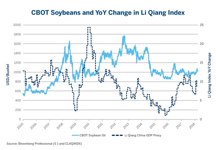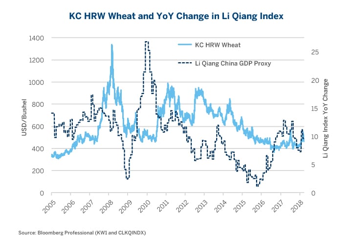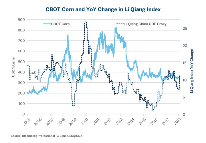 If the past is any guide, slower Chinese growth in 2018 might have little immediate bearing on the prices of agricultural goods but could impact them negatively as we move into the end of the decade if a Chinese slowdown does indeed impact metals, energy and commodity currencies negatively as well. It’s a lot of “ifs,” but as observers of both China and agricultural goods markets, we would pay especially close attention to the Li Keqiang GDP proxy, which appears more adept at forecasting future movements in agricultural goods prices than official GDP – as is the case for nearly all of the goods, currencies and interest rate products to which we have correlated it.
