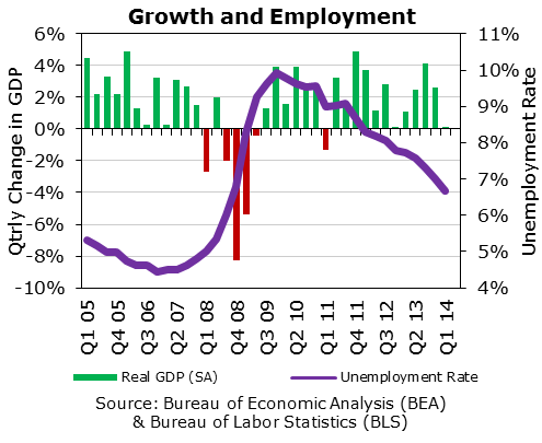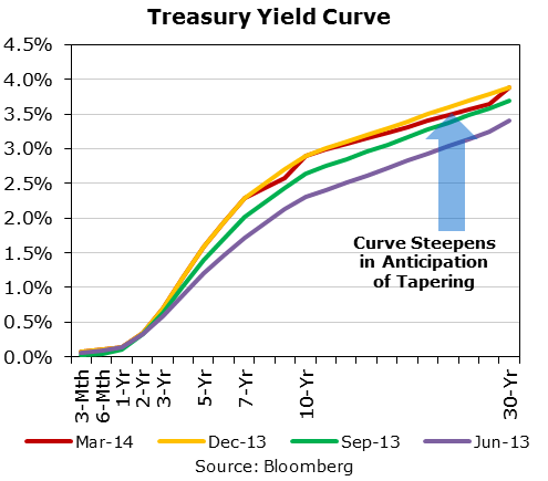 In response to improving economic conditions including moderate GDP growth and a declining unemployment rate, the Fed began to “taper” its QE program beginning in late 2013. As of this writing, the Fed has wound down its QE program to $45 billion of mortgage and Treasury securities on a monthly basis. Thus, the yield curve has begun to steepen as intermediate- to long-term rates have been allowed to rise a bit.