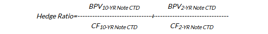 Where BPV = basis point value or the expected dollar change in value given a 0.01% or 1 basis point change in yield; CF = conversion factor of the security for delivery into futures; and, CTD = cheapest-to-deliver security into futures. You also need to recognize that the 2-year T-note futures contract is based upon a $200,000 face value unit while the 10-year T-note futures contract is based upon a $100,000 face value unit.