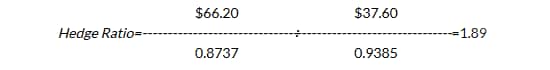 The hedge ratio is calculated as 1.89, suggesting that one should trade the spread on a 19-for-10 basis. I.e., buy nineteen (19) 2-year T-note futures vs. the sale of ten (10) 10-year T-note futures. Or, one may round this to a 2-for-1 spread.2