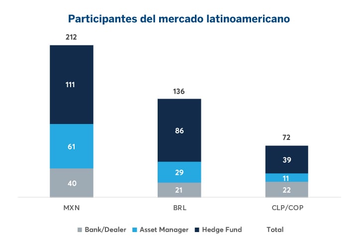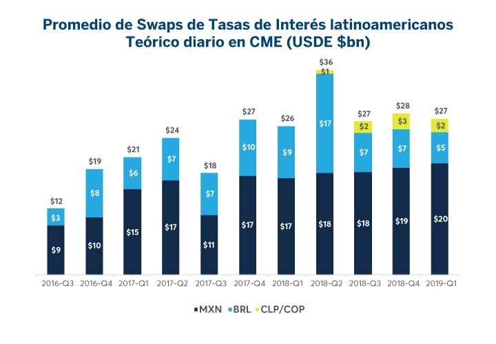 CME es el líder mundial en la compensación de swaps latinoamericanos (LatAm). Desde el lanzamiento de los swaps de MXN TIIE y de CDI brasileña, el volumen y los participantes han continuado creciendo en lo que ahora es un mercado de swaps compensados profundamente líquido. En respuesta a la fuerte demanda de los clientes, el 21 de mayo de 2018 lanzamos la compensación de swaps de Tasas de Interés en pesos chilenos (CLP) y Tasas en pesos colombianos (COP). Para mejorar la eficiencia en el uso de capital de nuestros clientes en sus negocios latinoamericanos, ofrecemos periódicamente ciclos de compresión triOptima para los swaps brasileños y mexicanos.