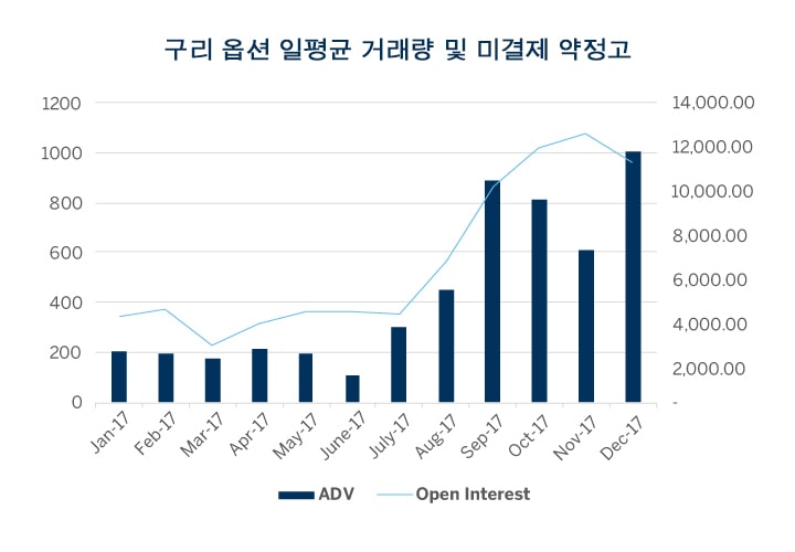 거래는 옵션 계약월 전월의 말일 직전 제 4 영업일 오후 1:00(미국중부표준시 정오 12:00)에 만료됨. 만기일이 금요일 또는 거래소 공휴일 직전일인 경우에는 직전의 영업일에 만기됩니다. |