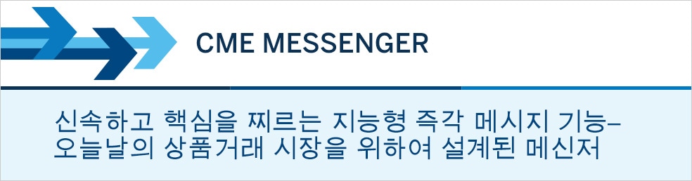 CME Messenger는 발전된 즉각 메시지 플랫폼으로서 특별히 상품 트레이더와 브로커를 위하여 설계되었습니다. CME Messenger는 지능형 내용분석 기술과 고도의 상호작용 환경 및 네트워크 안전성, 그리고 CME Direct 와의 직접 연결을 결합하여 귀하가 더욱 효율적으로 거래할 수 있도록 도와 줍니다.