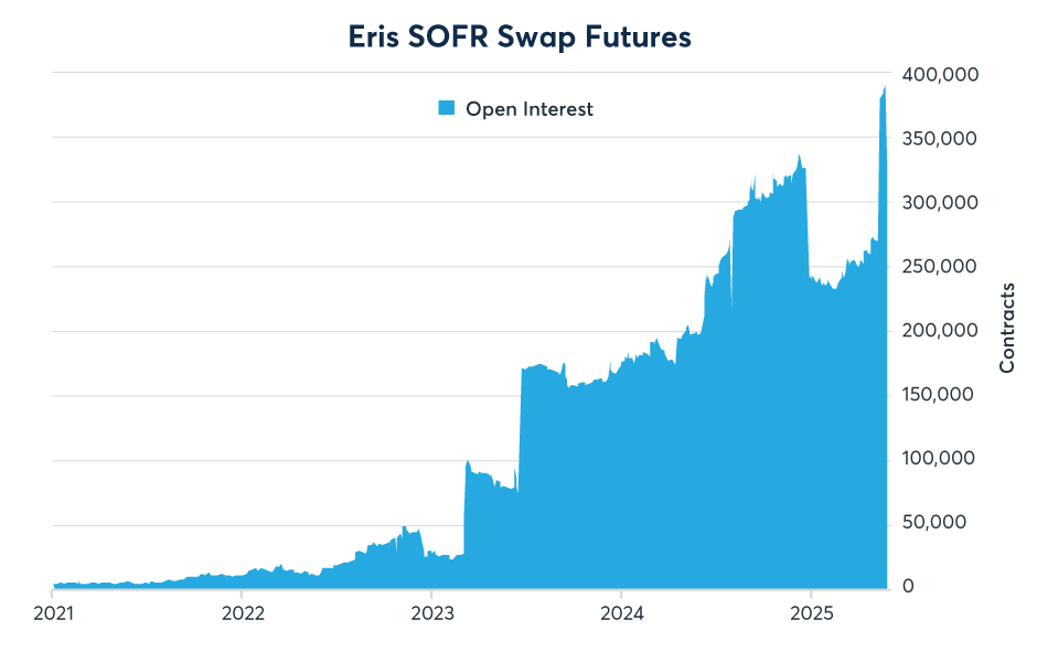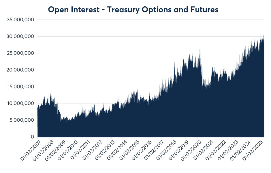 With heightened volatility, the need for precise risk management solutions has put our Monday, Wednesday and Friday expiring Treasury options suite in focus. So far in 2025, ADV is over 600K, while ADOI currently exceeds one million contracts, a YoY increase of over 20% for both metrics.