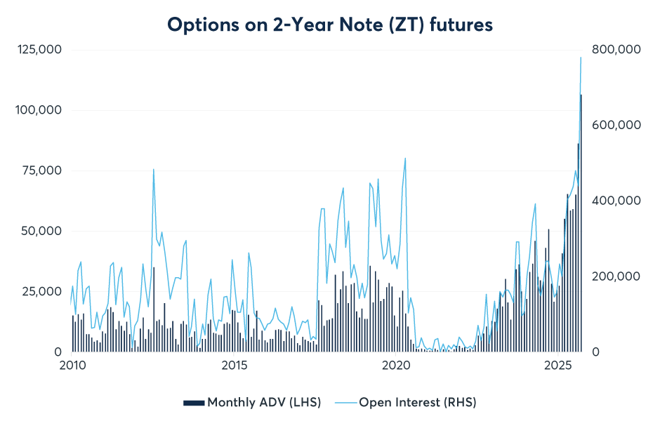 As uncertainty continues at the short-end of the curve, traders have embraced 2-Yr Treasury options as an efficient way to establish a position. September saw new records for both average daily volume (ADV) and open interest (OI), with ADV surging by more than 150% year-over-year (YoY).