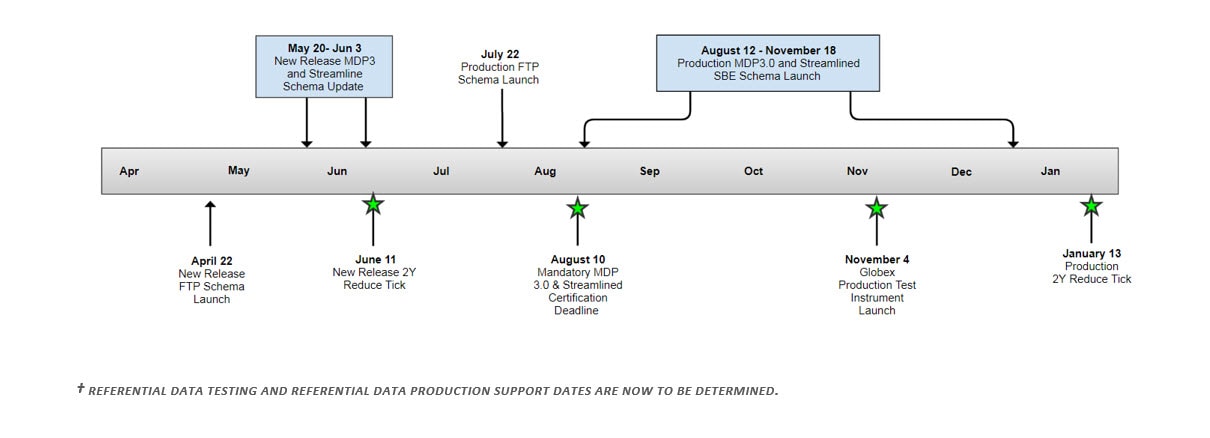 | June 3 | CME Globex Equity Futures excluding ES – 318 CBOT Globex Equity Index Futures - 342 CBOT Globex Interest Rate Options - 345 CBOT Globex Commodity Futures II – 346 NYMEX Globex Emissions Futures – 380 NYMEX Globex Nat Gas & Other Non-Crude Energy Futures - 386 |