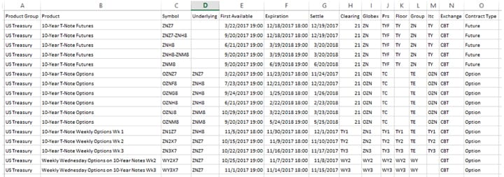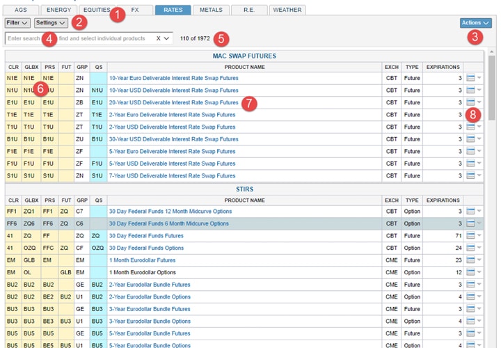 Any text entered into the Search Textbox will start by searching all four of the (yellow) highlighted columns for a match (e.g. CL). You can also search for multiple symbols at the same time (e.g. CL, NG). If you type more than three characters, the search will try to match on the Product Name text (e.g. eurodollar options).